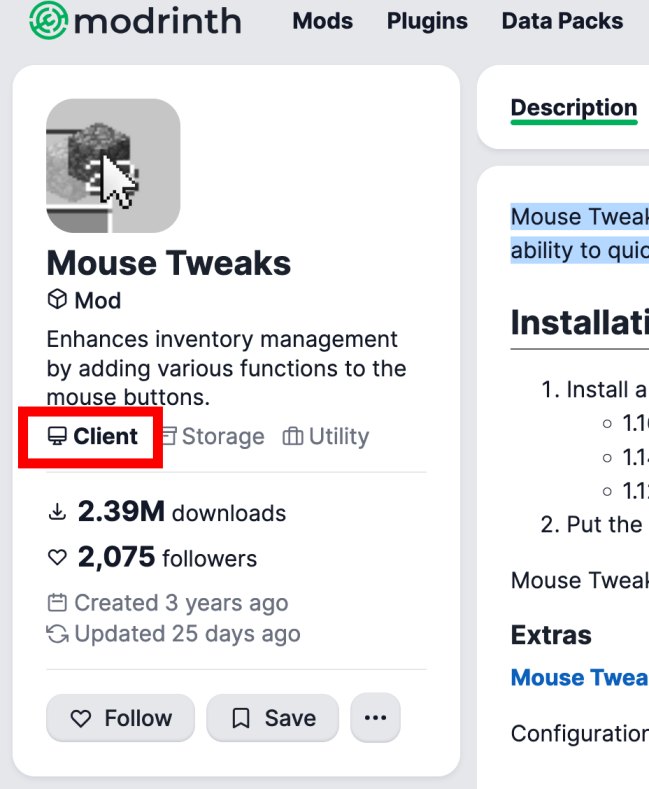 Měli byste přibližně tušit, jaké módy na server nepatří. Např. mód který pracuje se shadery se serverem nijak nesouvisí, nijak s ním neiteraguje, jelikož shadery se starají pouze o vykreslování u klienta, z čehož si dokážete vyvodit, že mód na server nepatří. To stejné platí pro uvedené MouseTweaks. Popis na stránce módu je: “Mouse Tweaks replaces the standard RMB dragging mechanic, adds two new LMB dragging mechanics and an ability to quickly move items with the scroll wheel.” To taktéž se serverem nijak nesouvisí a ovlivňuje pouze chování klienta.